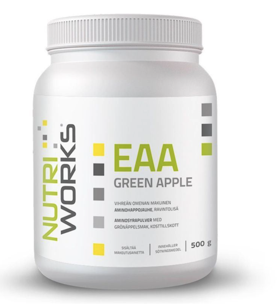 NutriWorks EAA Green Apple je doplněk stravy v práškové formě obsahující směs esenciálních aminokyselin (EAA) — L-leucin, L-isoleucin, L-valin, L-threonin, L-methionin, L-lysin, L-fenylalanin a L-tryptofan. Tyto aminokyseliny jsou běžnou součástí stravy a jejich zastoupení v produktu vychází z obvyklého složení směsí EAA. Produkt je dále doplněn o L-citrullin-DL-malát. Prášek má osvěžující příchuť zeleného jablka.