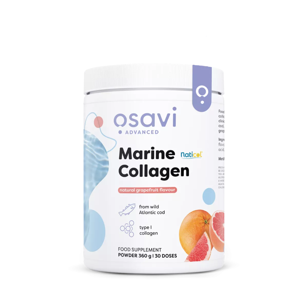 Osavi Marine Collagen Wild Cod Grapefruit je doplněk stravy ve formě prášku, který obsahuje kolagenní peptidy Naticol® a vitamin C. Kolagen patří mezi nejrozšířenější bílkoviny v lidském těle a je základní složkou pojivových tkání — přirozeně se nachází v kůži, kostech, chrupavkách, šlachách a vazech. Produkt je obohacen o vitamin C.