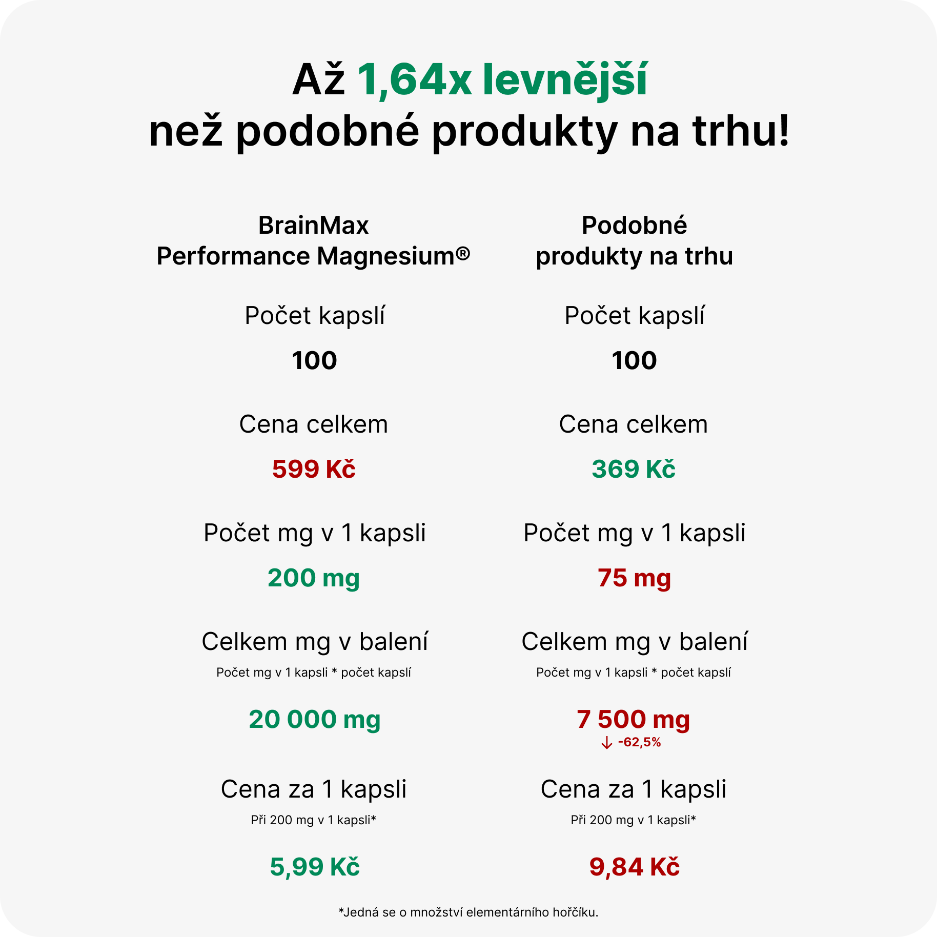 Při přepočtu hořčíku (účinné látky) vychází naše magnésium až 1,64x levněji než je průměr na trhu u podobných produktů