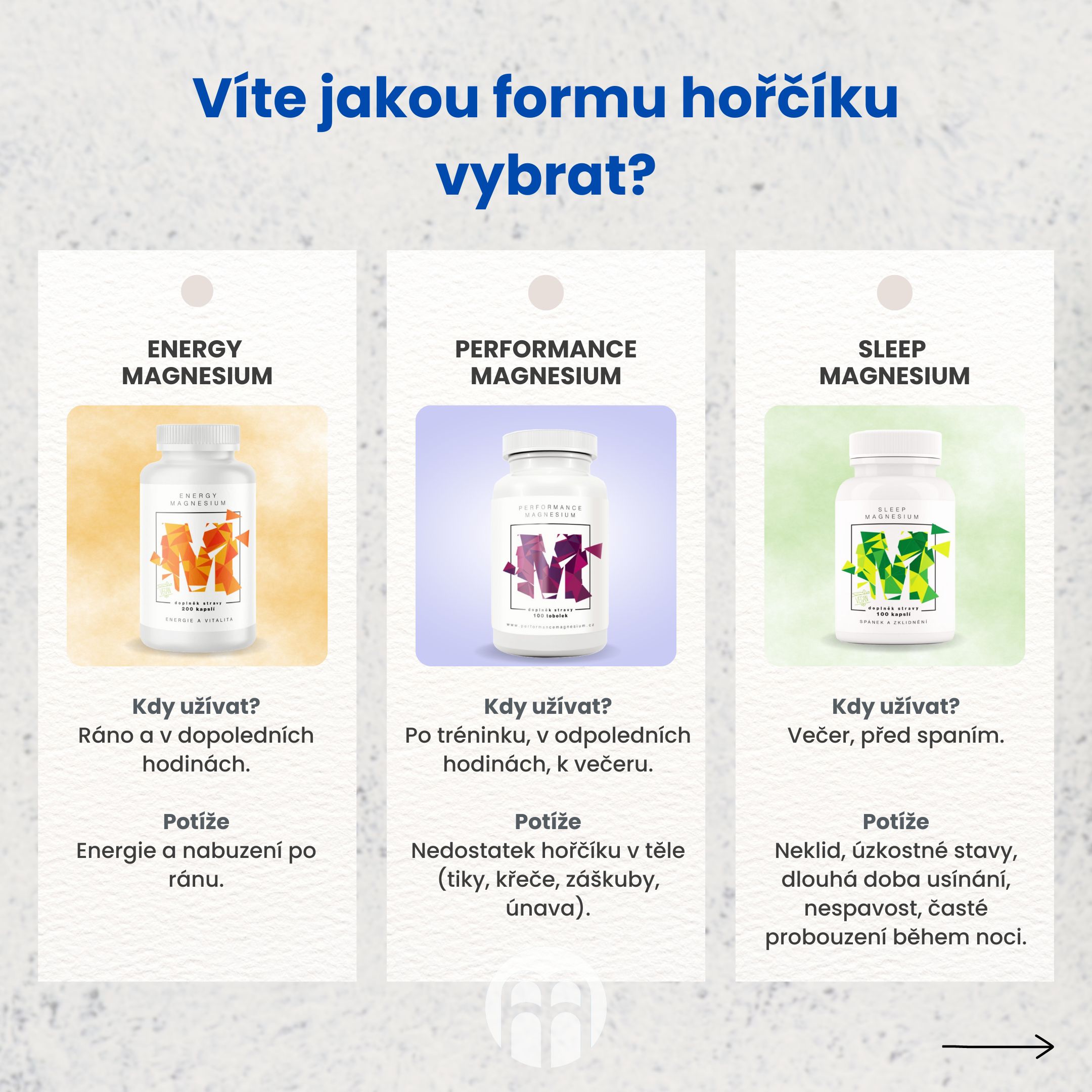 Pro správné doplnění hořčíku v průběhu dne je ideální začít ráno s Energy Magnesium®, které obsahuje hořčík malát přispívající k normálnímu energetickému metabolismu. Performance Magnesium®, které kombinuje hořčík bisglycinát a vitamín B6, doplňujte po fyzické aktivitě nebo odpoledne, aby přispělo k normální činnosti nervové i svalové soustavy a snížení únavy a vyčerpání. Sleep Magnesium® užívejte zhruba 30 minut před spaním. Tento doplněk obsahuje hořčík bisglycinát a další látky, které mají vliv na kvalitu spánku.