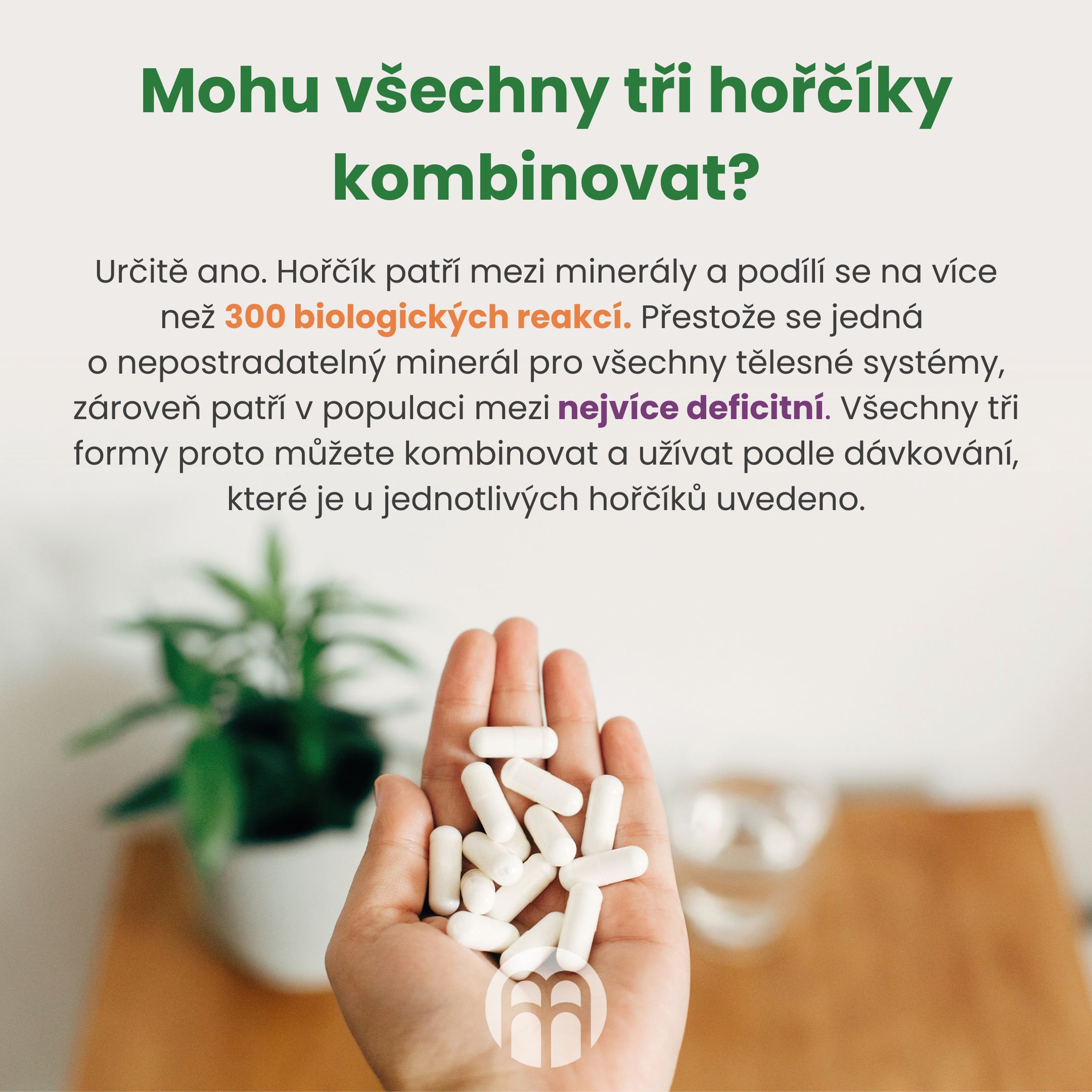 - Chelátová organická forma: Hořčík + aminokyselina glycinu.