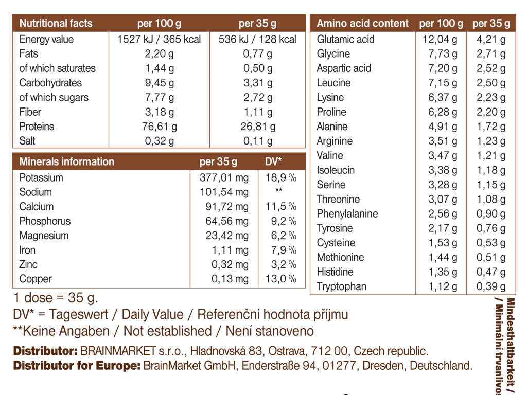 Rozmíchejte 1 zarovnanou odměrku (35 g) s 200 ml vody nebo mléka. S ohledem na denní příjem bílkovin užívejte 1-3 dávky denně. Své využití najde nejen po tréninku, ale i při přípravě snídaňové kaše, smoothie, nebo klidně i při pečení pro obohacení klasických buchet a dezertů o cenné bílkoviny.
