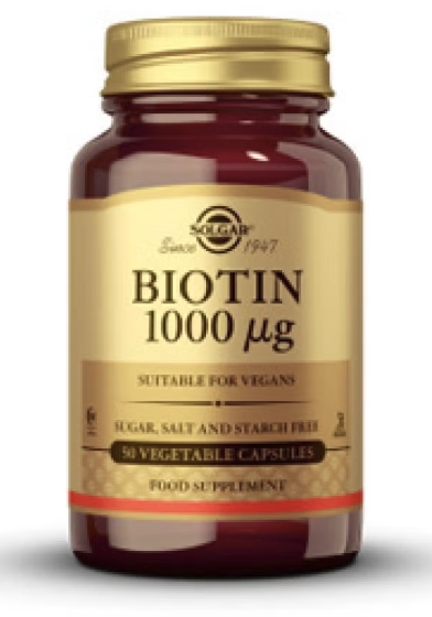 Biotin, známý také jako vitamin B7 nebo vitamin H, je ve vodě rozpustný vitamin skupiny B, který přispívá k normální činnosti nervové soustavy a k normální psychické činnosti a k udržení normálního stavu vlasů, pokožky a sliznic.