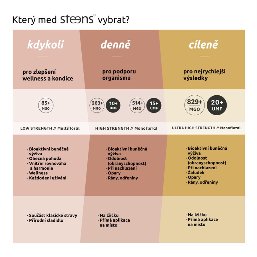 Steens Manuka Honey je raw nepasterizovaný pravý manukový med z Nového Zélandu. Pochází od včel opylujících Balmín metlatý, keř s bílorůžovými květy pocházející původně z Austrálie a Zélandu, kde mu původní domorodé maorské kmeny daly název Manuka. Med z květů Manuky má výjimečný výživový profil – obsahuje celé spektrum enzymů, aminokyselin, antioxidantů, vitamínů, minerálů a dalších látek s velmi zajímavými vlastnostmi. Manukový med je také známý jako chuťově výraznější, bohatší a plnější než jiné medy. Je to dáno velmi vysokou koncentrací účinných látek.