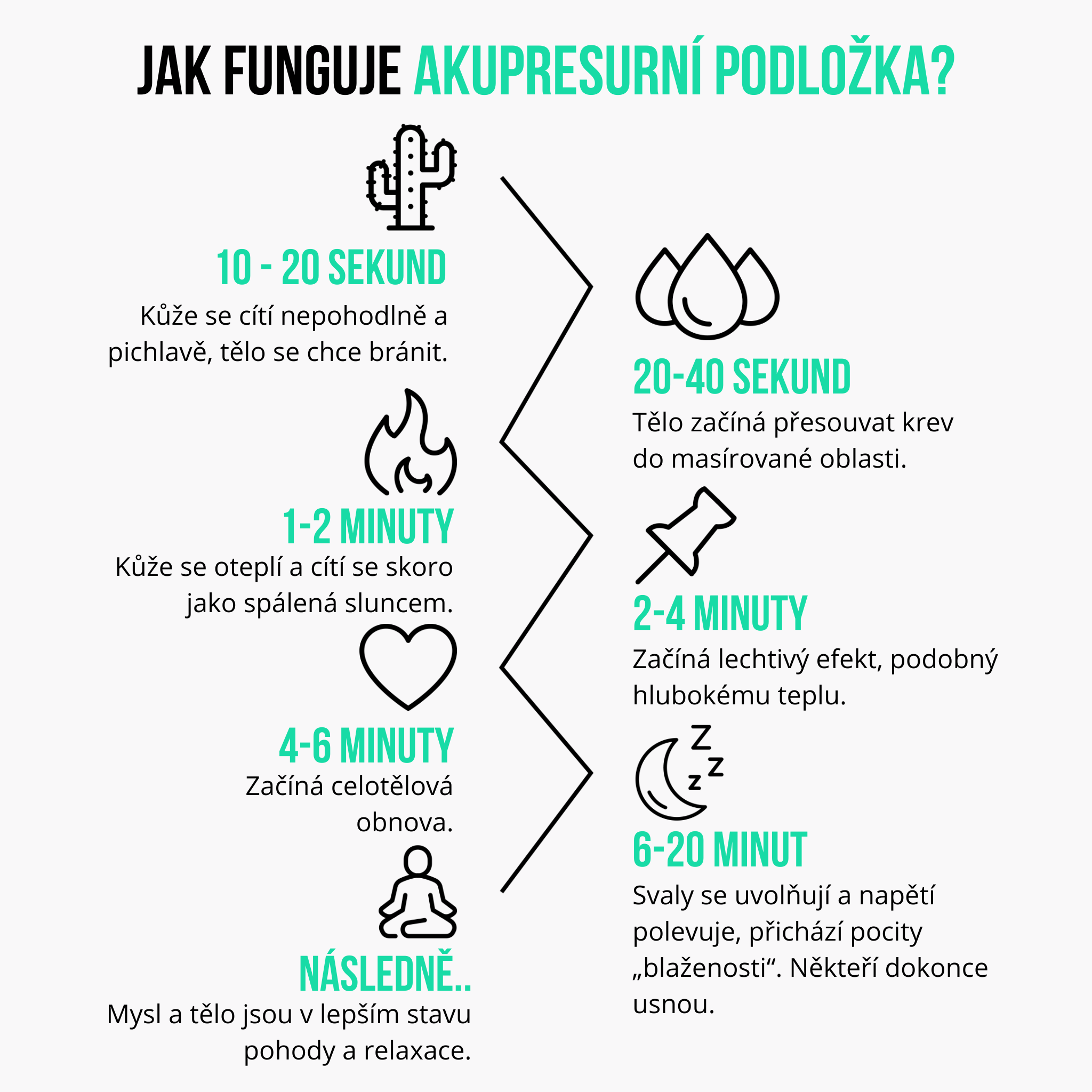 Svalové napětí je častou příčinou bolesti, zejména v oblasti zad a krku. Na těle jsou specifické tlakové body, které jsou spojeny s různými částmi těla a orgány. Akupresurní podložka má mnoho malých, ostrých bodců, které tyto body stimulují. První seznámení s podložkou je intenzivní, ale příjemné. Po těle se line teplo, které vás během pár minut zbaví napětí a sníží bolest. Podložka je výborná před spaním, protože podpoří rychlejší usnutí a hlubší spánek.