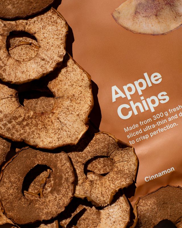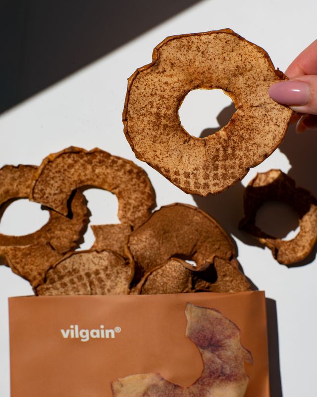 Vilgain Apple Chips jsou vyrobené prémiových čerstvých jablek od pečlivě vybraných evropských farmářů. Žádné nesmysly navíc – jen šetrně sušené plátky jablek odrůd Golden Delicious, Jonagold a Idared s přirozenou sladkostí a výraznou křupavostí.