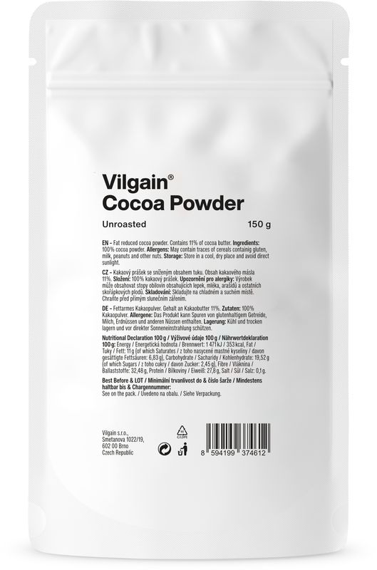 Balení: 150 g 100 g Energetická hodnota 1471 kJ / 353 kcal Tuky 11 g - z toho nasycené mastné kyseliny 6,8 g Sacharidy 19,5 g - z toho cukry 2,5 g Vláknina 32,5 g Bílkoviny 27,8 g Sůl 0,1 g Ingredience 100 % kakaový prášek. Obsah kakaového másla min. 11 %. Upozornění pro alergiky: může obsahovat obiloviny obsahující lepek, mléko, arašídy a skořápkové plody.