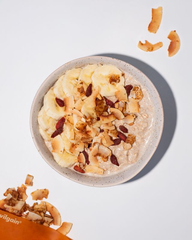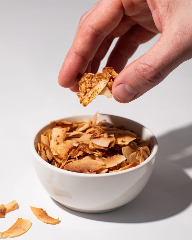Pečený kokos se skvělou chutí a čistým složením. Obsahují vlákninu a minerální látky. Navíc se mohou pochlubit nízkým glykemickým indexem, takže snadno zasytí a nebude tě po nich honit mlsná.