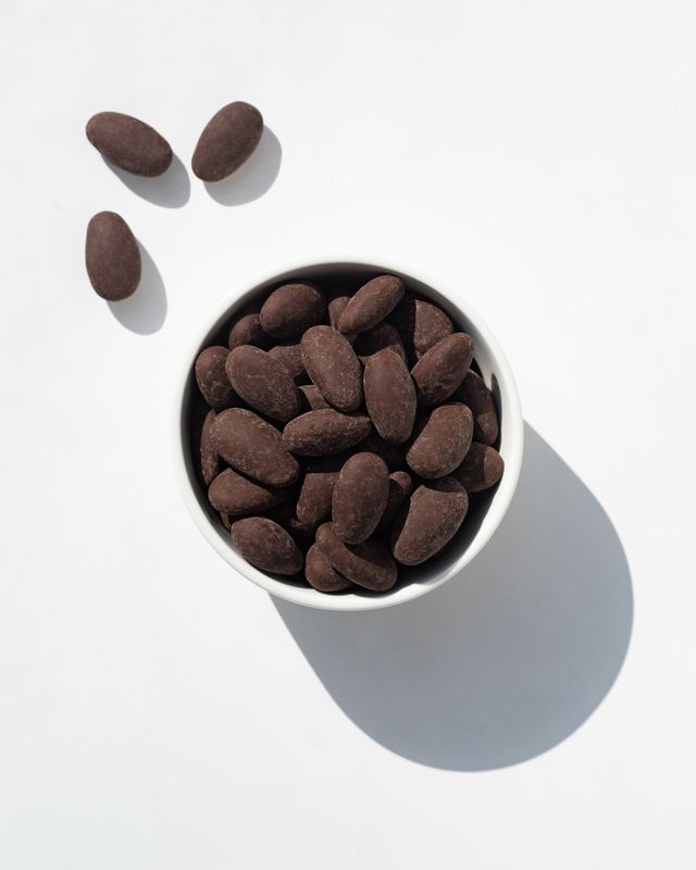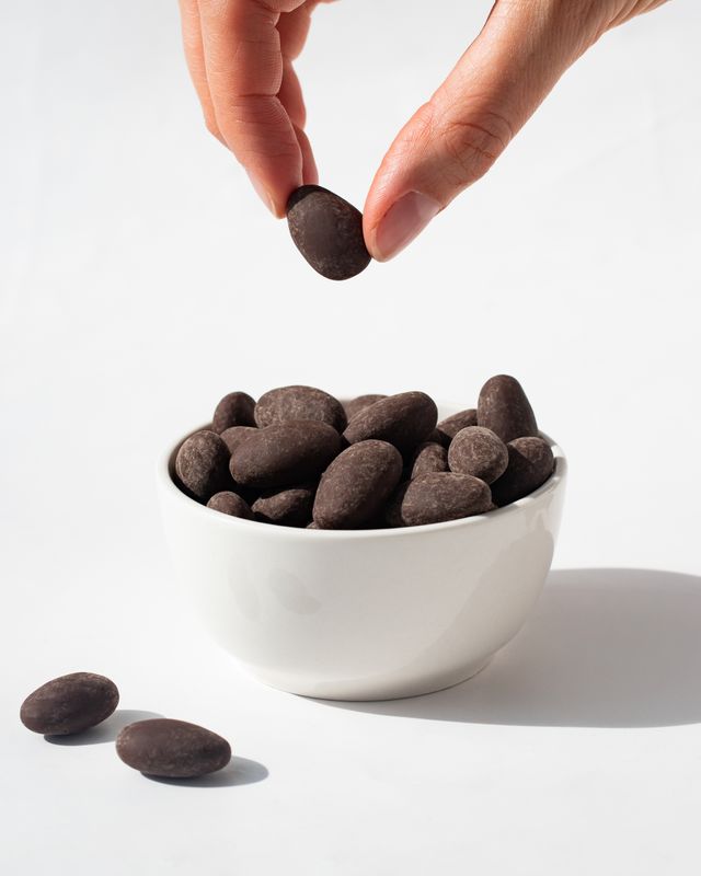 Ručně vybrané, čerstvé mandle jsme nejprve mírně nasucho opražili, a potom zalili pořádnou vrstvou kvalitní čokolády. Takto šetrně vyrábíme Vilgain Mandle v hořké čokoládě vždy v malých šaržích, aby se k tobě dostaly maximálně čerstvé a křupavé.