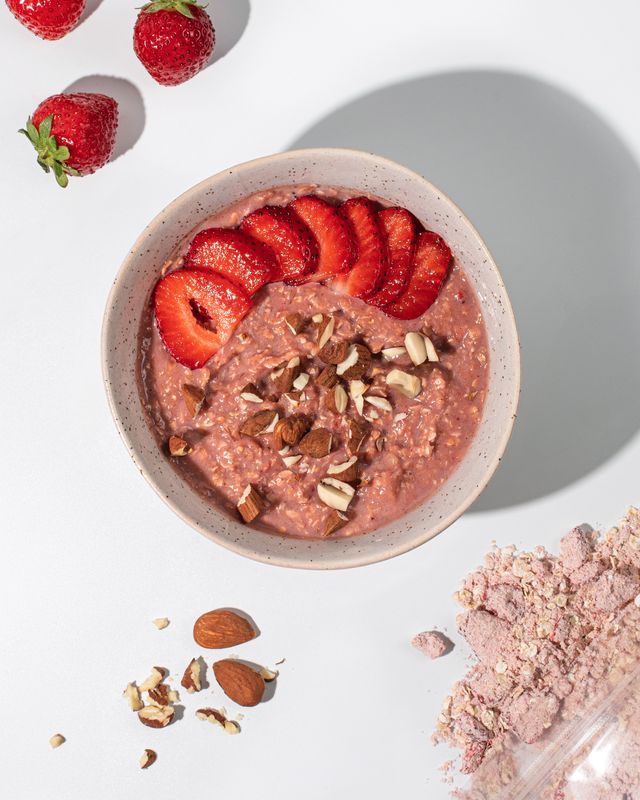 Balení: 400 gDávkování: 80 gDávek v balení: 5 100 g80 gEnergetická hodnota1582 kJ / 375 kcal1266 kJ / 300 kcalTuky7,8 g6,2 g- z toho nasycené mastné kyseliny2,2 g1,7 gSacharidy43 g34 g- z toho cukry15 g12 gVláknina6,6 g5,3 gBílkoviny31 g25 gSůl1,02 g0,82 gIngredienceBezlepkové ovesné vločky 47,1 %, mléčný protein 28,4 %, třtinový cukr, mrazem sušené jahody 6,6 %, mandle, sušené kokosové mléko*, řepový prášek*, mořská sůl. * Z ekologického zemědělství.Upozornění pro alergiky: Alergeny jsou vyznačeny tučně ve složení produktu. Může obsahovat arašídy a ostatní skořápkové plody.