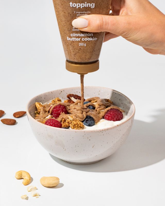 Vzali jsme naše oblíbené ořechové máslo a proměnili ho v extra krémový, hustý topping, po okraj nabitý oříšky. Stačilo přidat jen špetku skořice a vanilky a neodolatelná pochoutka byla na světě.