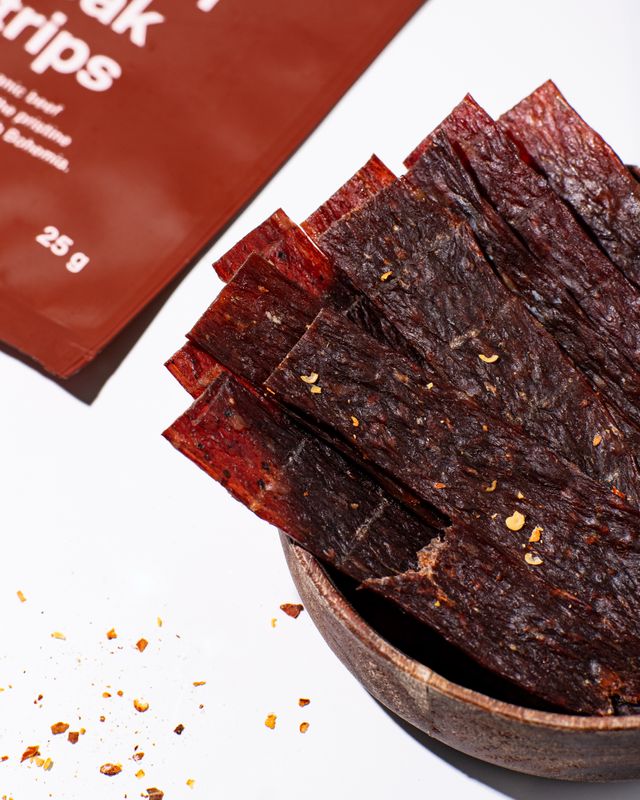 Vychutnej si naše sušené plátky masa ve formě jerky proužků s ještě měkčí a jemnější strukturou.