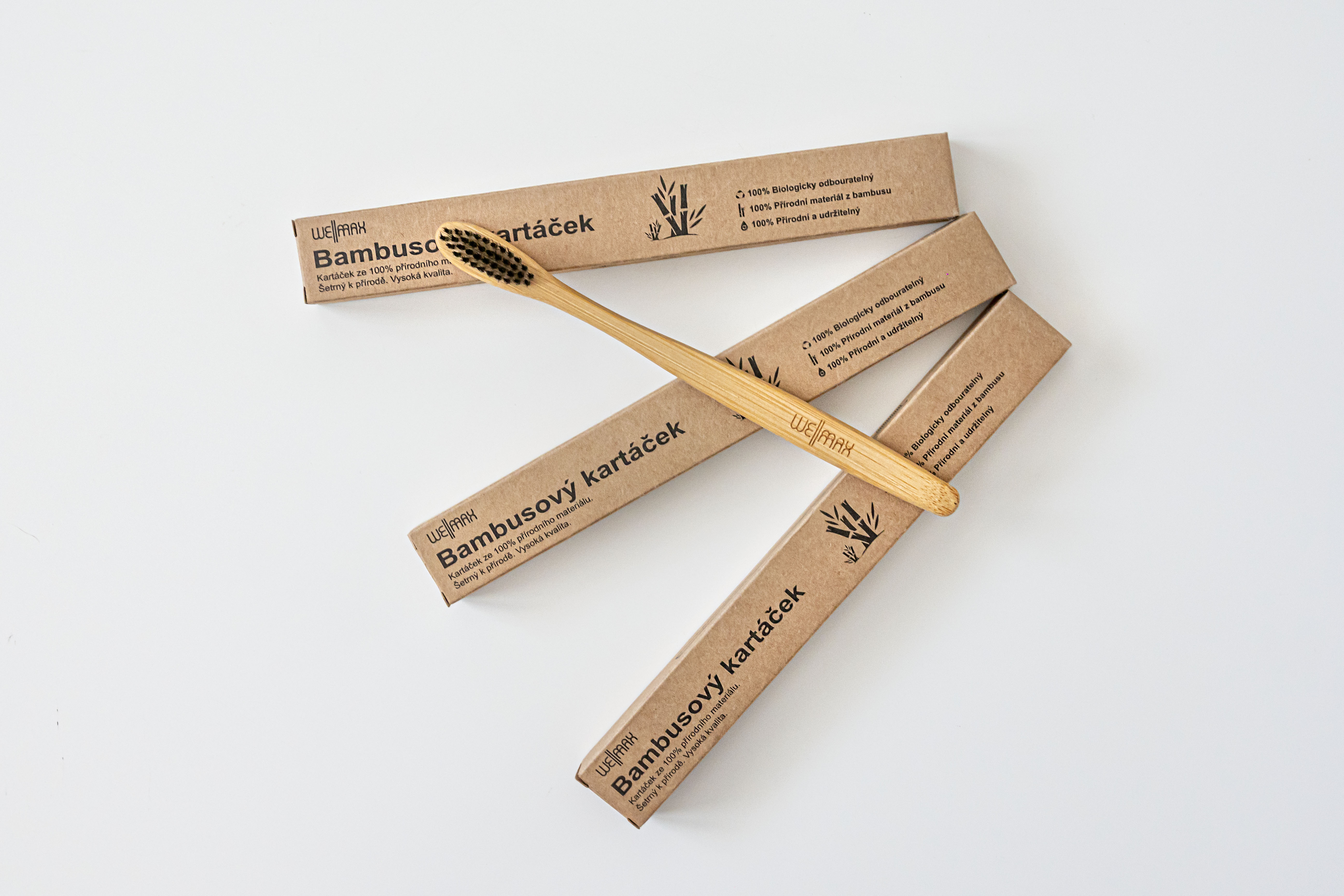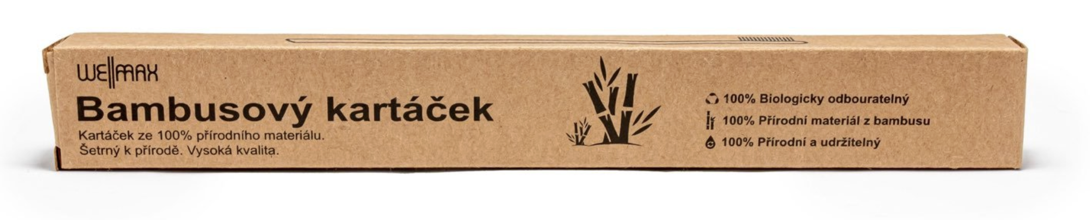 Zubní kartáček WellMax je vyroben výhradně a ze 100% z přírodního bambusu, včetně štětinek. Rukojeť kartáčku je vyrobena z tepelně ošetřeného bambusu pocházejícího z bambusu pěstovaného udržitelným způsobem a není nijak impregnována nebo lakována. Štětinky jsou vyrobeny z obnovitelných a biologicky odbouratelných vláken bambusové celulózy, zubní kartáček je tak jako komplet zcela rozložitelný v přírodě a je možné jej také zkompostovat (bude to trvat déle, ale nakonec se rozloží na humus a poslouží tak jako hnojivo rostlinám a květinám na vaši zahrádce). Výrobky z bambusu mají výhodu oproti plastu a dřevu v tom, že neuvolňují ani nepřejímají pachy, neflekatí, jsou přirozeně antibakteriální a vydrží déle a více než klasické dřevo.