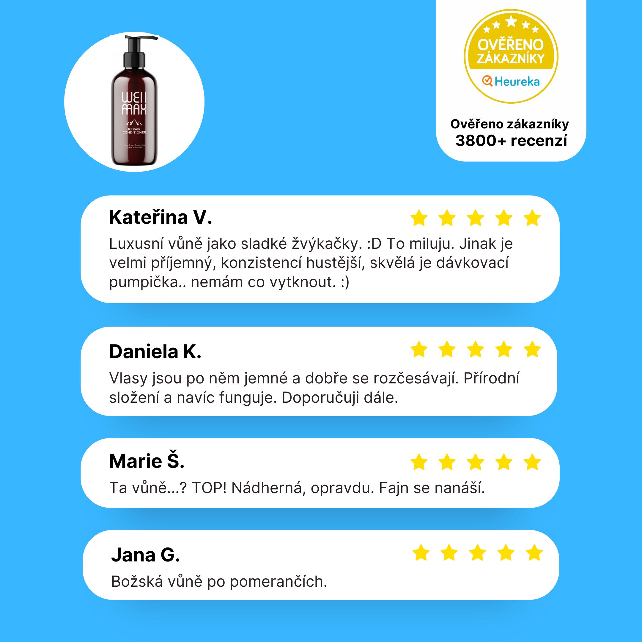 Wellmax obnovující kondicionér je díky svému složení vhodný na každodenní péči. Obsahuje kvalitní přírodní extrakty a oleje, které vlasy hydratují a vyživují od kořínků až po konečky. Účinné látky pomáhají obnovovat přirozenou vlasovou strukturu a zacelují roztřepené konečky. Obsažené přírodní tenzidy nahrazují funkci chemických sulfátů, a díky tomu jsou vhodné i pro citlivou pokožku hlavy, nedráždí a nevysušují. Vlasy jsou tak díky kondicionéru hebké, lesklé a posílené.